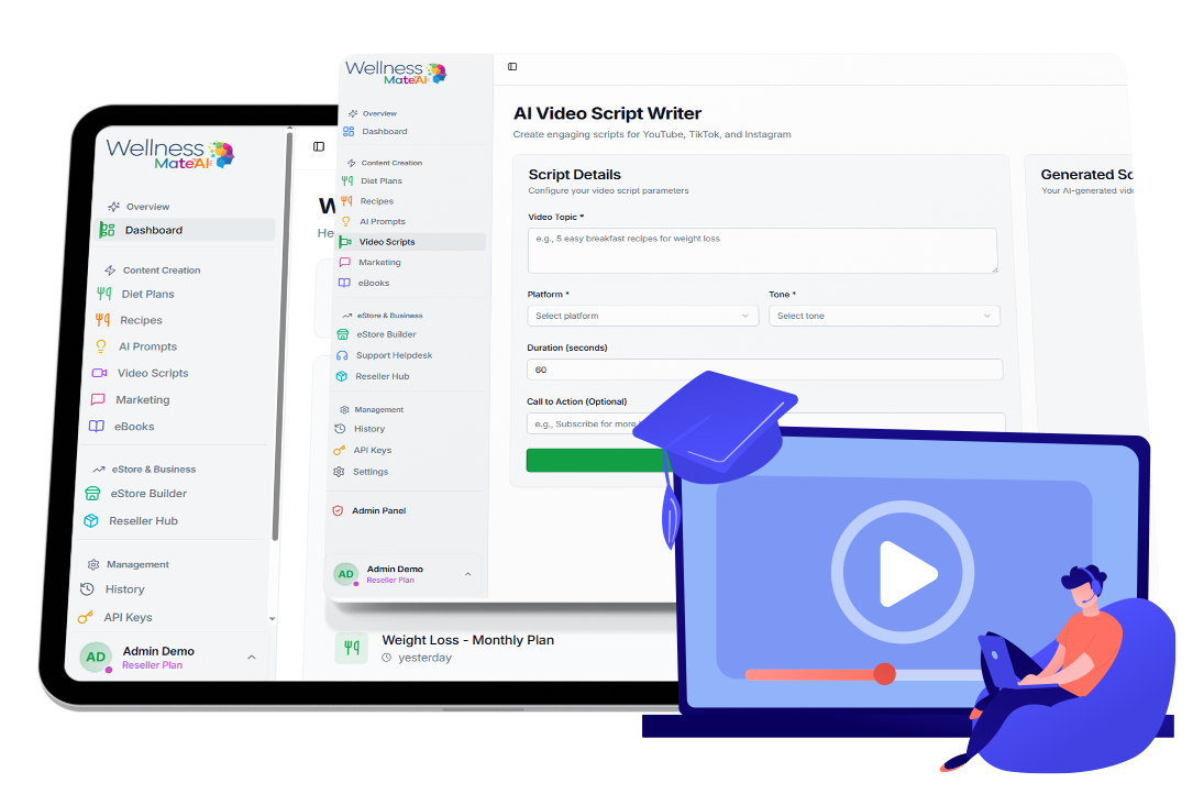 WellnessMateAI is powered by next-level Artificial Intelligence-far more advanced, accurate, and faster than generic AI tools that clog the market. It generates wellness content, diet plans, courses, and whiteboard-style training videos 10x faster, with unmatched precision and quality. No more waiting. No more lagging dashboards. No more low-quality outputs. WellnessMateAI delivers lightning-fast results and a smooth, professional workflow that helps you scale effortlessly.