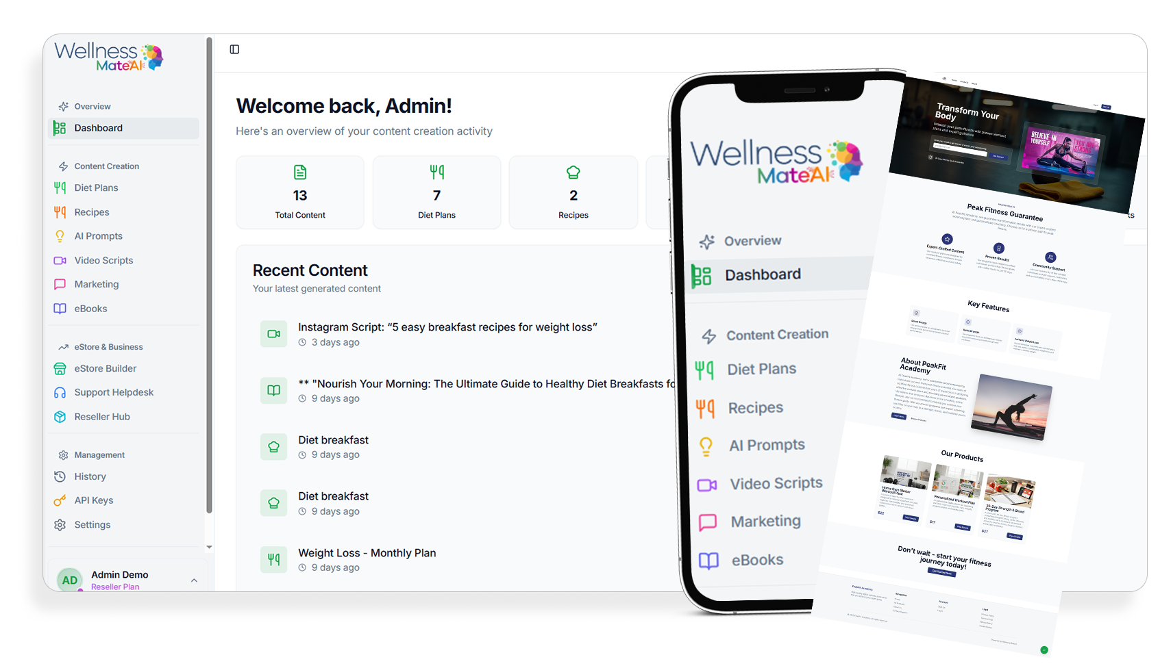 The Brand-New, World’s First AI App that builds stunning health & wellness websites, creates full wellness programs, diet plans, recipe eBooks, fitness guides, Health & Wellness Prompts and Marketing Content in Health & Wellness - all in minutes!