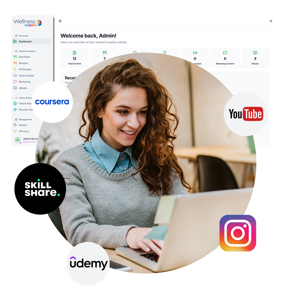 WellnessMateAI creates entire Udemy-style wellness platforms, along with courses, eBooks, diet plans, meal guides, Health & Wellness Prompts, and more in minutes.